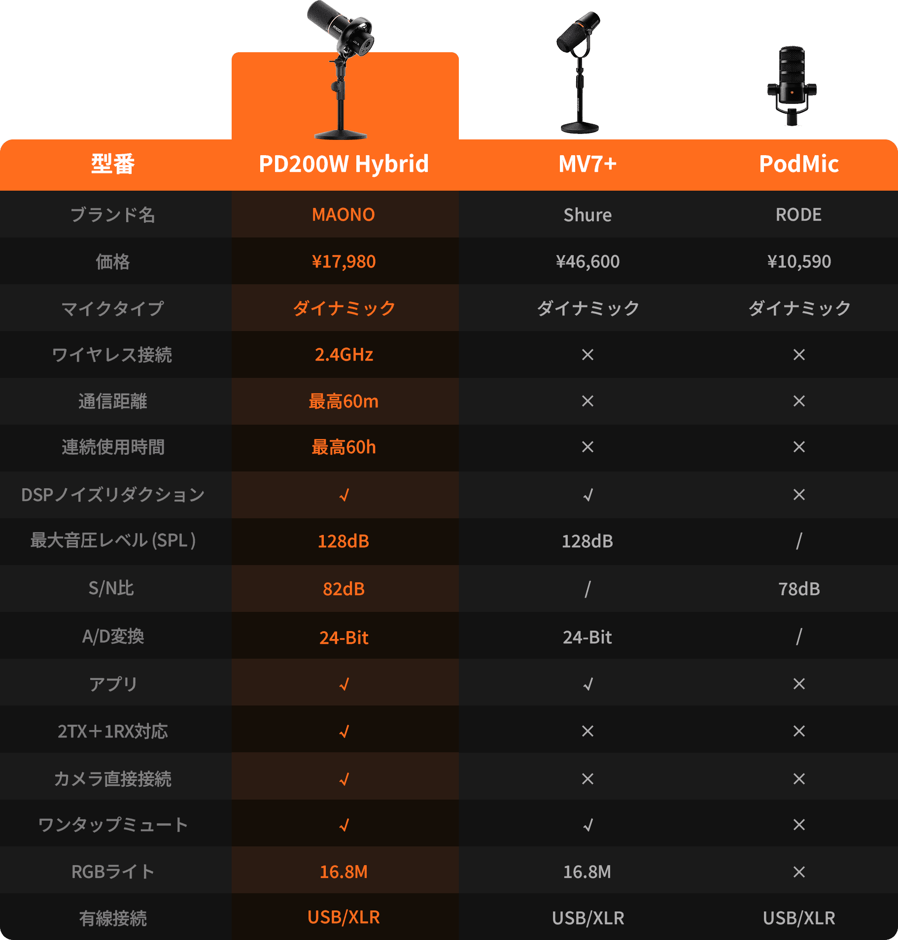 機材に合わせる必要はありません。あなたの制作スタイルに、マイクが合わせます。 PD200W Hybridは、XLR / USB / 2.4GHzワイヤレスの3つの接続方式を1本のダイナミックマイクに統合。機材に縛られない環境をつくります。