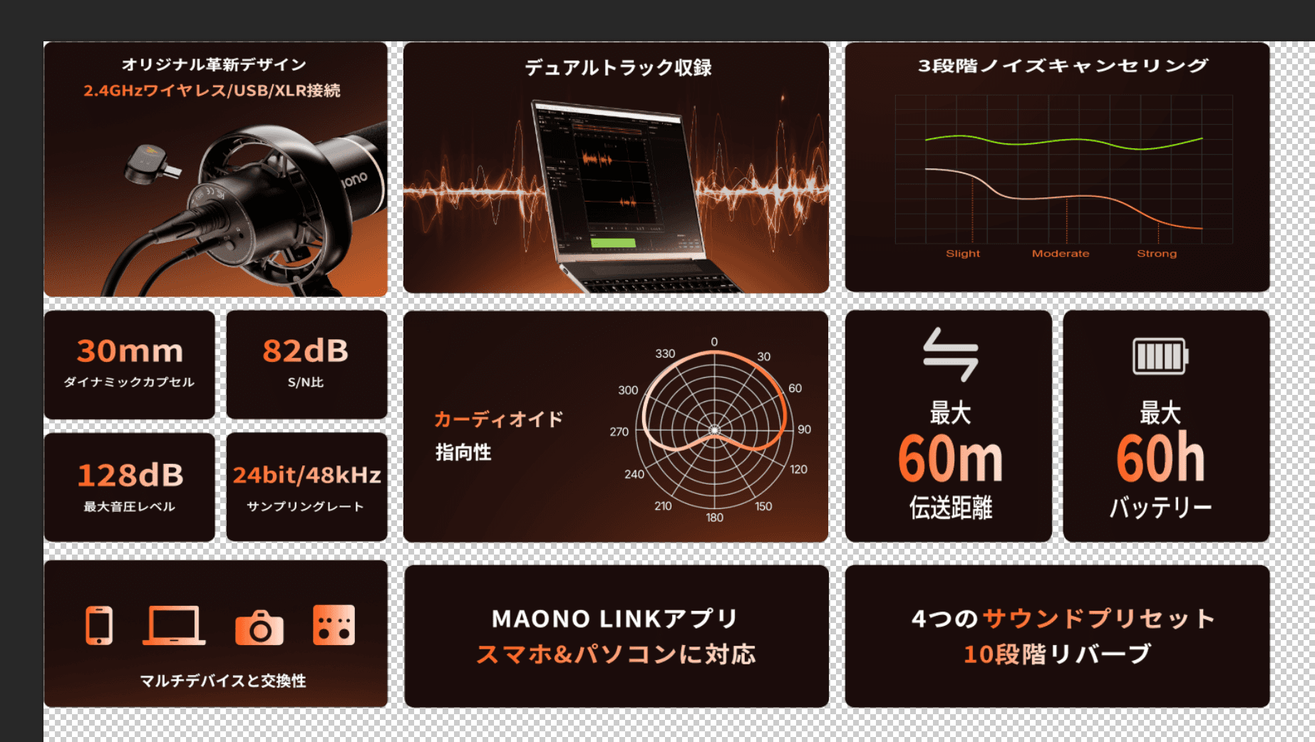 Maono Link アプリ(スマートフォン/PC対応)から、マイク設定を直接コントロール可能。音量、ノイズ低減、音色調整、リバーブなどを直感的に操作できます。PCがなくても、スマートフォンだけで細かなチューニングが可能。内蔵サウンドカードとスマート調整機能により、調整作業をよりシンプルに。